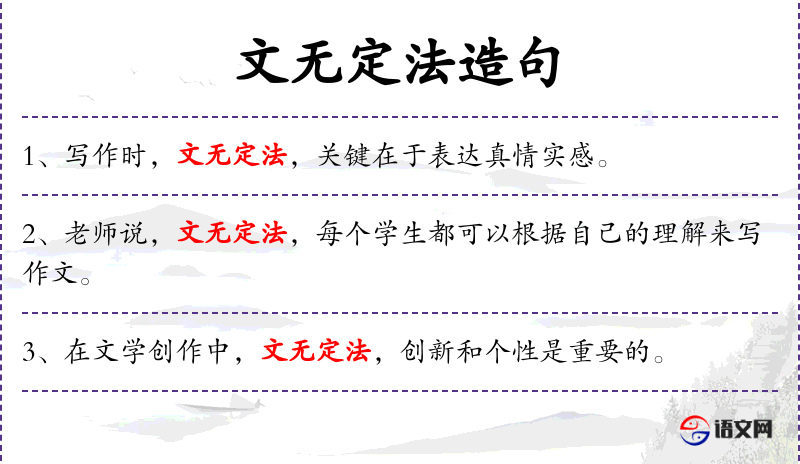- 宾语:文无定法,每个学生都可以根据自己的理解来写作文