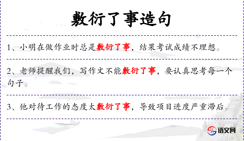 - 宾语:“太敷衍了事”,形容主语对待工作的态度。