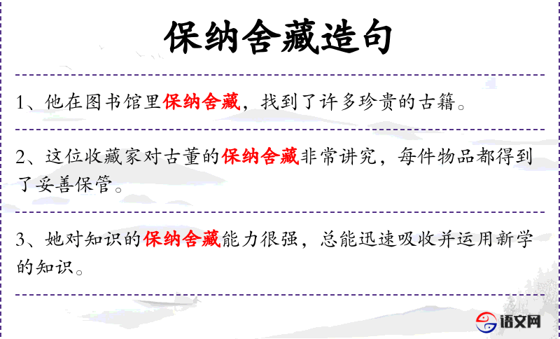 - 保纳舍藏:这个词组可能存在误用,通常“保纳”和“舍藏”不是常用搭配。正确的表达可能是“保护和收集”。