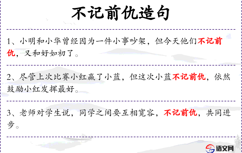 - 不记前仇:表示不再记恨过去的矛盾。