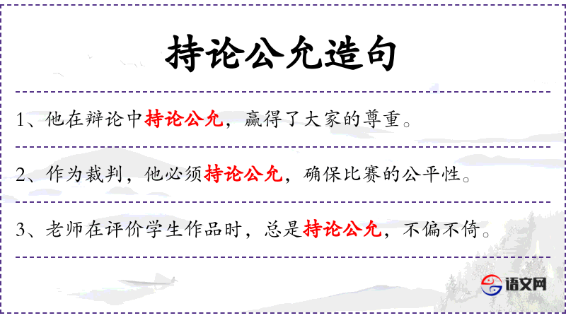 - 持论公允:动词短语,指在辩论或讨论中保持公正、不偏不倚的态度。