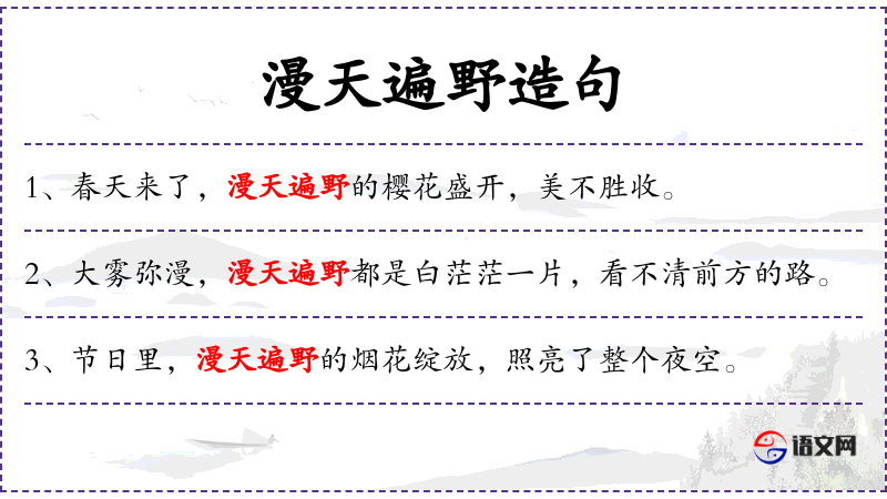 1. 【漫天遍野】 - 满山遍野,形容数量多、分布广。