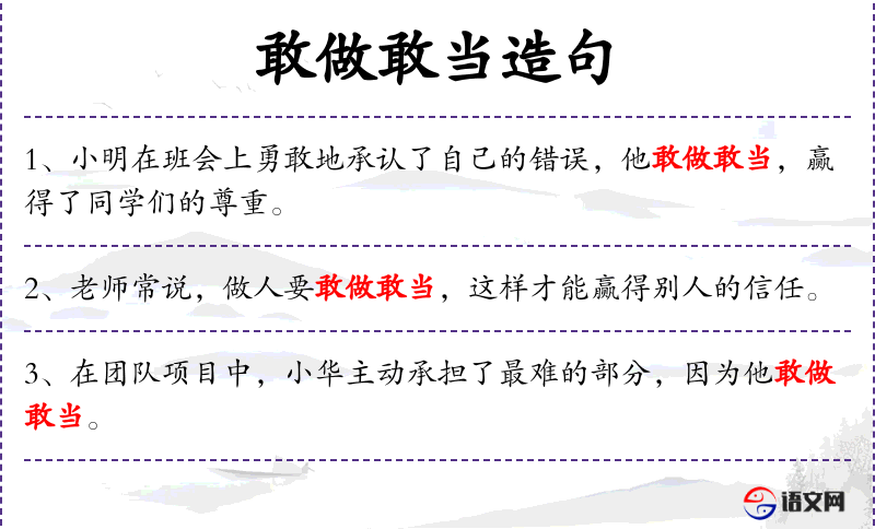 - 成语:“敢做敢当”体现了这种文化价值观。