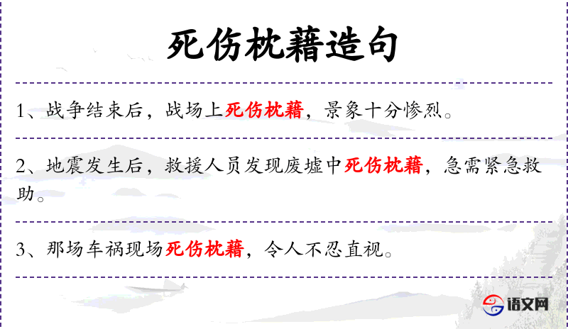 3. 【死伤枕藉】 - 枕藉:纵横相枕而卧。形容死亡的人非常多。