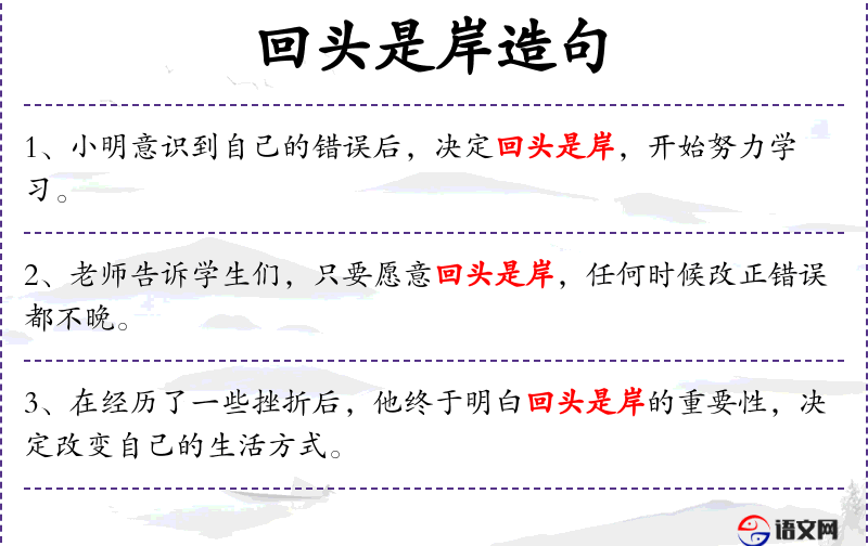 - 回头是岸:这个成语源自**,意味着在错误的道路上及时回头,避免更大的错误。