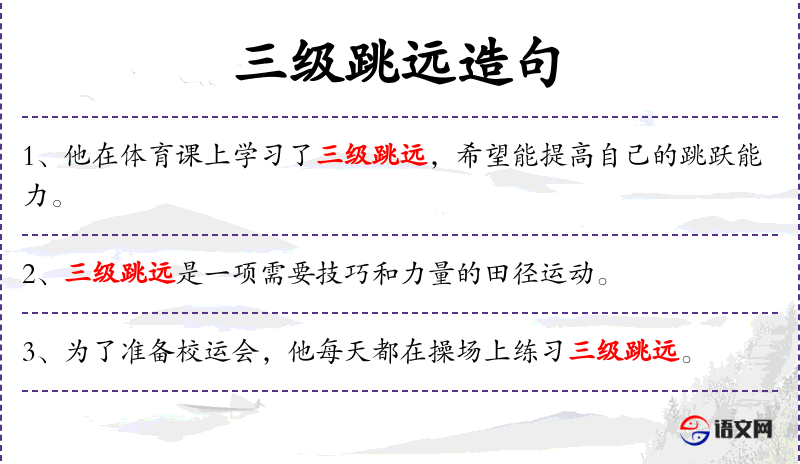 1. 【三级跳远】 田径运动项目之一,运动员经过快速助跑后连续跳三步,第一步用起跳的脚落地,第二步用另一只脚落地,第三步两脚落地。