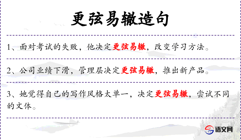 1. 【更弦易辙】 比喻改变方法或态度。