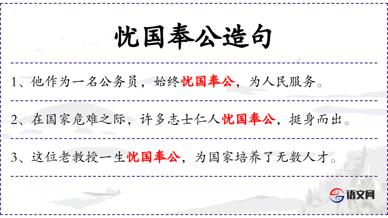 - 忧国奉公:成语,意思是关心国家大事,尽职尽责。