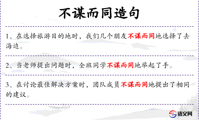 谋:商量;同:相同。事先没有商量过,意见或行动却完全一致。