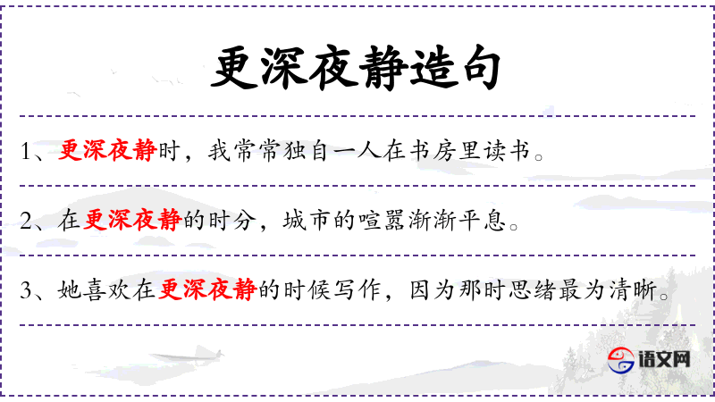 1. 【更深夜静】 更:旧时夜间计时单位。一夜分五更,每更约两个小时。夜已很深,没有一点声响。形容夜深处于一片寂静之中。