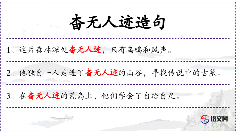 1. 【杳无人迹】 - 杳:不见踪影;迹:脚印。连一个人的脚印也看不到。形容地方非常荒凉、偏僻,从来没有人去过。