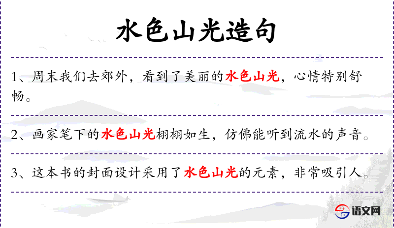 1. 【水色山光】 - 水波泛出秀色,山上景物明净。形容山水景色秀丽。