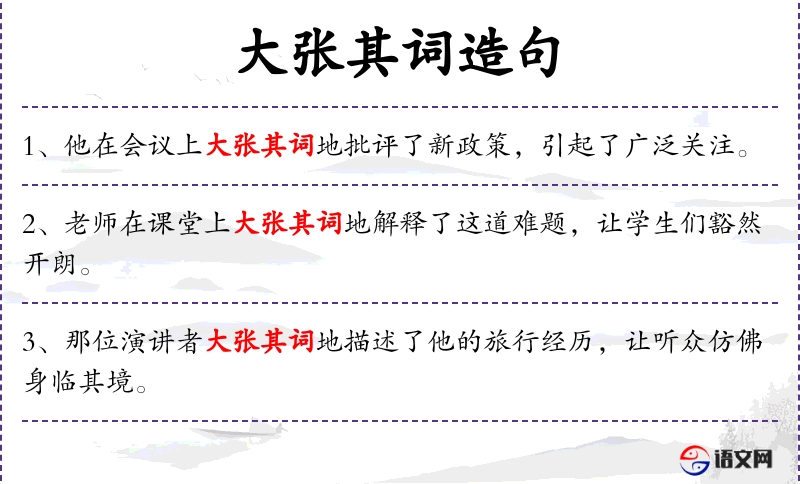 在不同语言中,“大张其词”这一表达可能有所不同,但核心意思都是形容说话者以夸张的方式表达,以吸引注意。在翻译时,需要确保这一含义在目标语言中得到准确传达。
