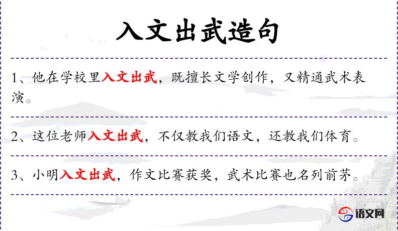 - 入文出武:形容一个人文武双全,既有文学艺术才华,又有武术技能。