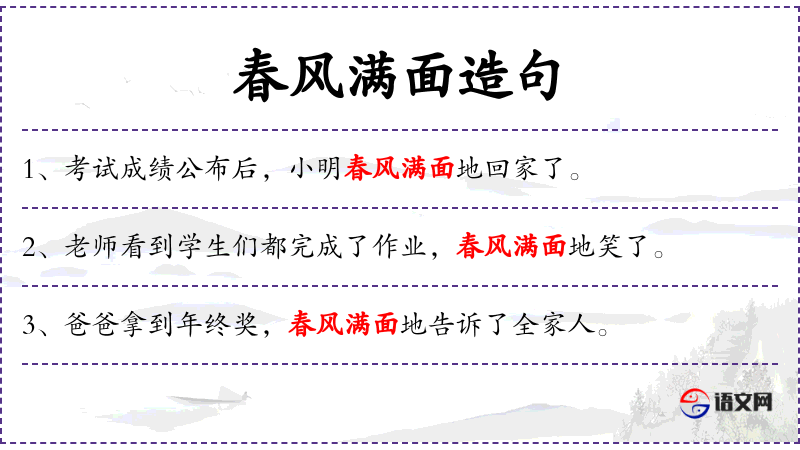 - 春风满面:成语,形容人因为高兴而脸上洋溢着喜悦。