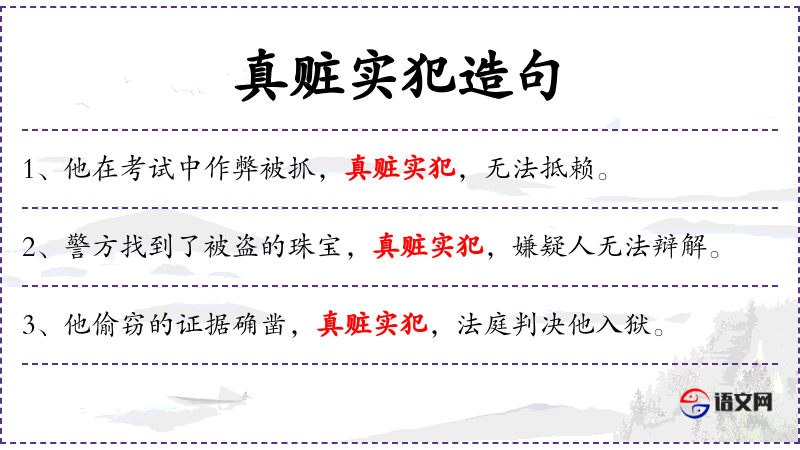1. 【真赃实犯】 - 赃物是真的,罪犯是确实的。泛指犯罪的证据确凿。