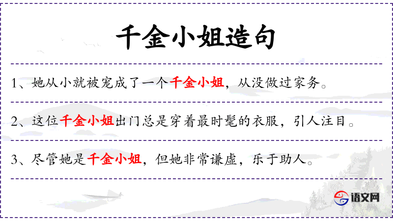 - 千金小姐:指富家女,通常带有娇生惯养的意味。