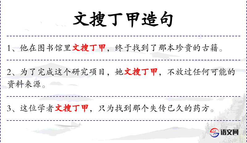 - 文搜丁甲:可能是一个成语或特定表达,意指深入研究或搜集资料。