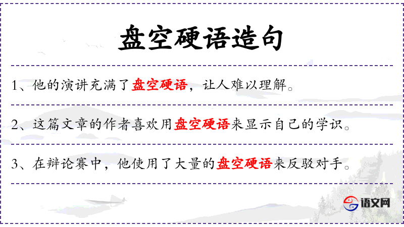 4. 【盘空硬语】 硬:指行文遒劲有力。语言遒劲有力像能在空中盘旋一样。形容诗文气势磅礴,矫健雄浑。