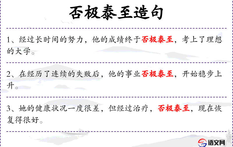 - 否极泰至:成语,意思是逆境达到极点,就会向顺境转化。