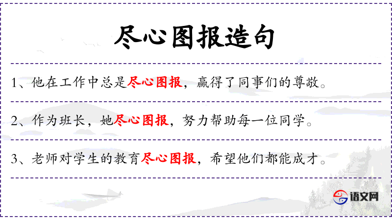 - 状语:“在工作中”、“总是”、“尽心图报”
