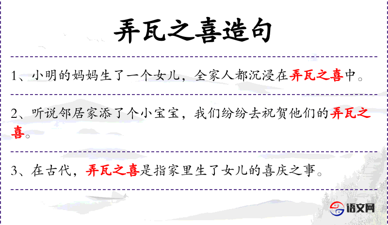 - 弄瓦之喜:这个词组可能源自**传统文化,指的是家庭中新房建成或屋顶修缮完成时的喜庆。