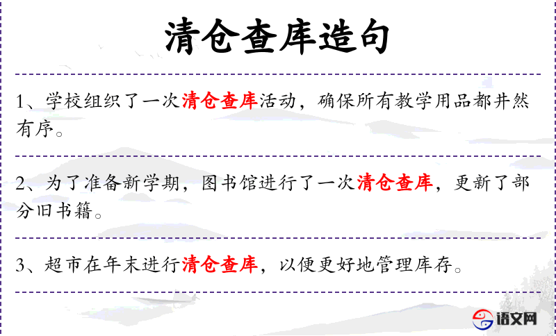 1. 【清仓查库】 检查、清理仓库物资。