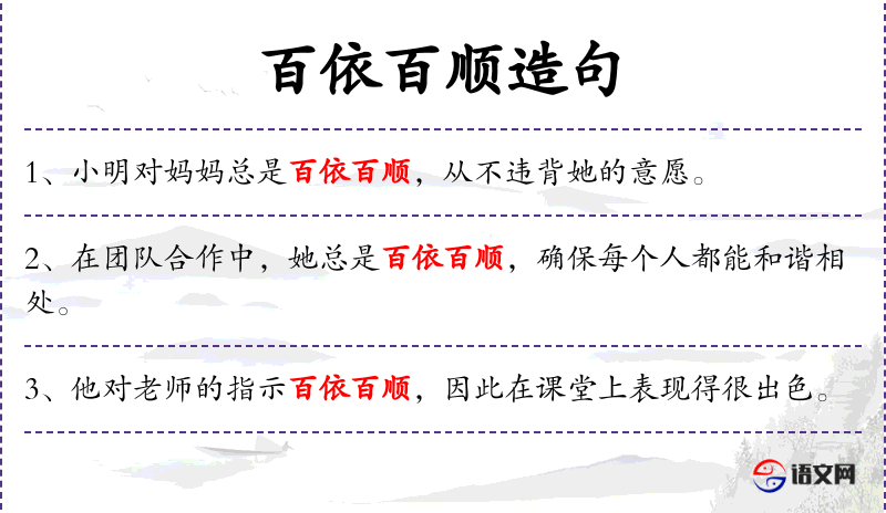 3. 【百依百顺】 - 依、顺:顺从。什么都依从。形容一切都顺从别人。