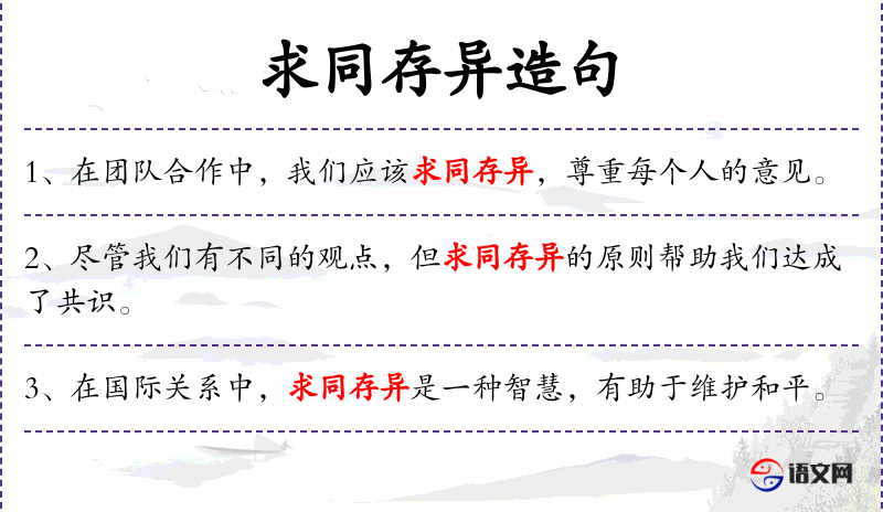 4. 【求同存异】 求:寻求;存:保留;异:不同的。找出共同点,保留不同意见。