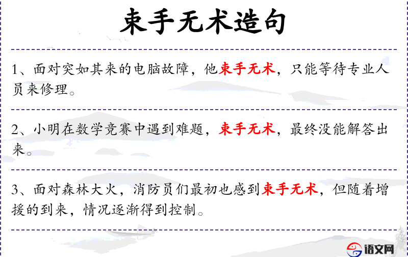 4. 【束手无术】 - 指捆住双手,无计可施。形容遇到问题没有解决的办法。