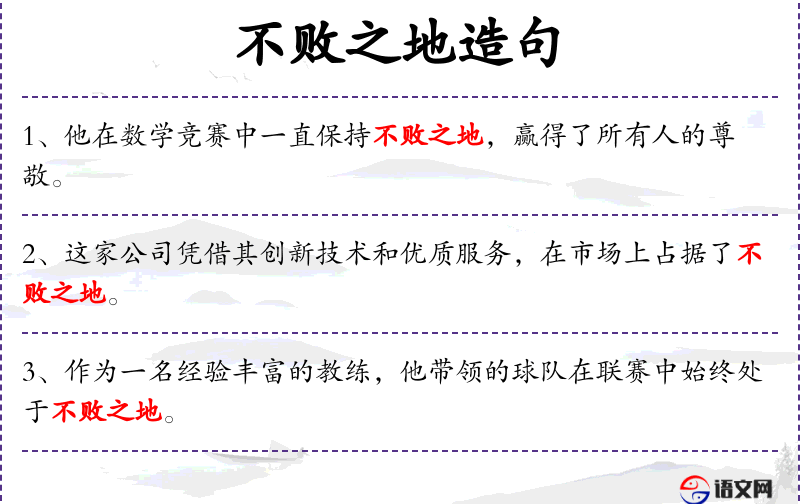 1. 【不败之地】 原意是指善于打仗的就有取胜的把握,不会落到挫败的境地。后泛指办事有成功的充分把握。