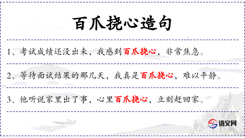 3. 【百爪挠心】 - 像有一百只脚爪在抓心一样。形容人心情错综复杂,心神不定。