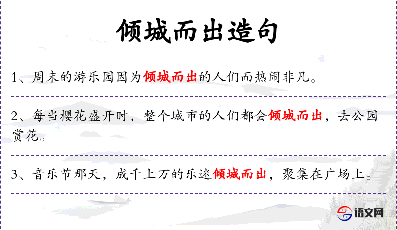 - 倾城而出:形容词性短语,表示人们从城市各处涌出,形容人数众多。
