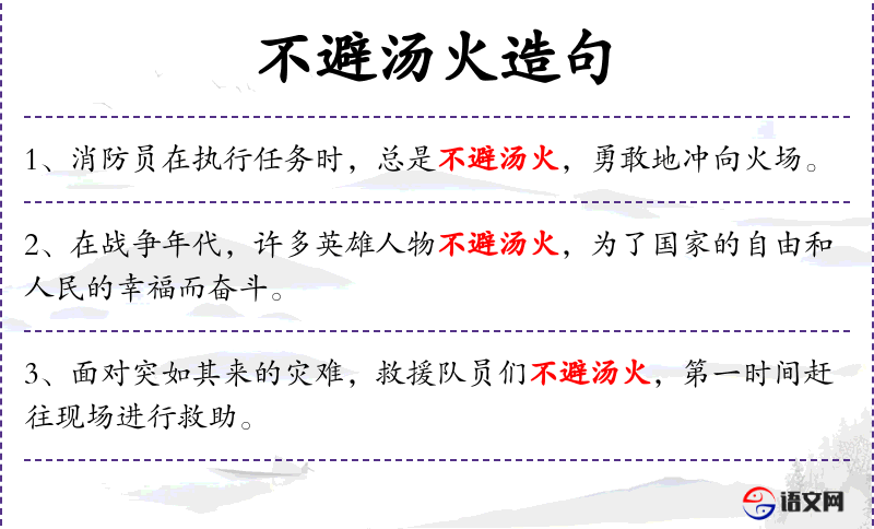 - 状语:在洪水来袭时、不避汤火、冒着被洪水冲走的危险