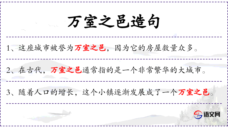 1. 【万室之邑】 万室:万户;邑:城镇,指封地。有万户居民的城镇。