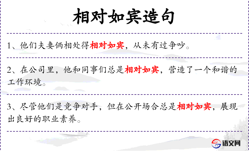 1. 【相对如宾】 形容夫妻互相尊敬,象对待宾客一样。
