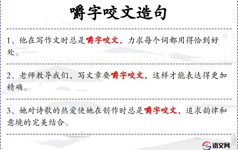- 嚼字咬文:比喻仔细推敲文字,力求精确。