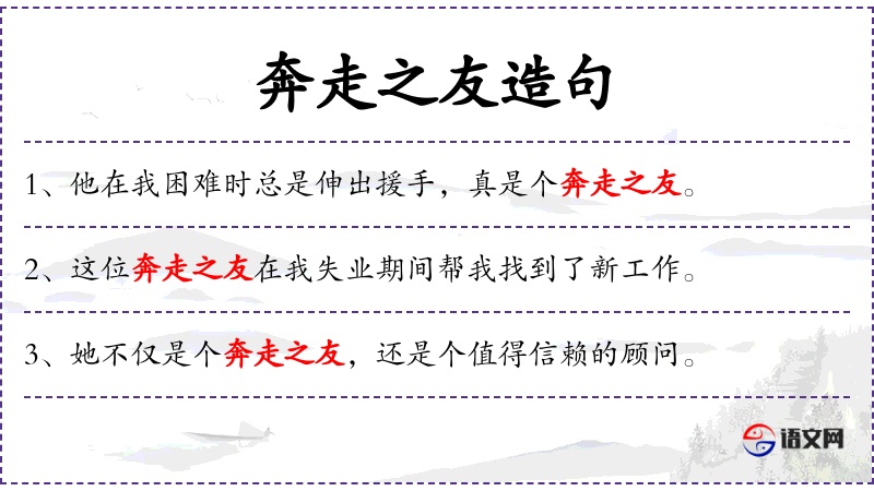 - 奔走之友:名词短语,指在行动上给予帮助的朋友。