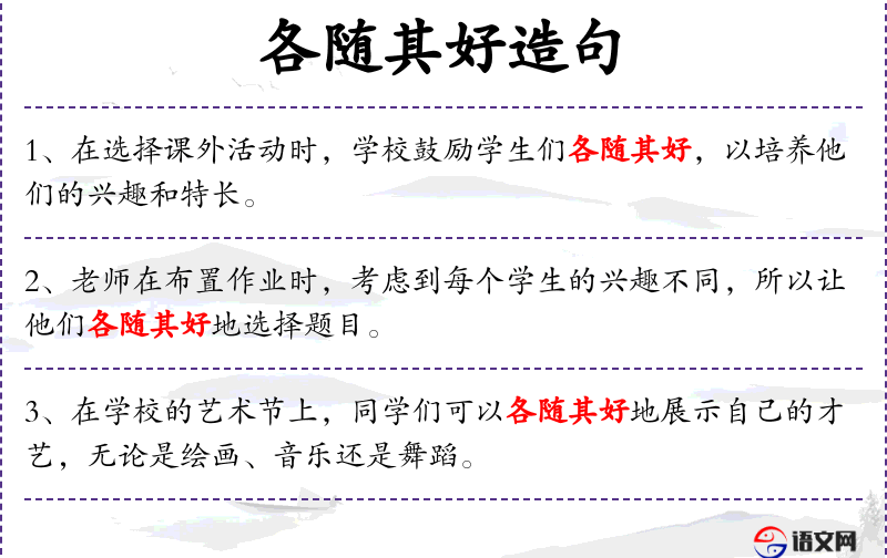 4. 【各随其好】 随:随顺;好:爱好。使每个人都顺随自己的爱好。
