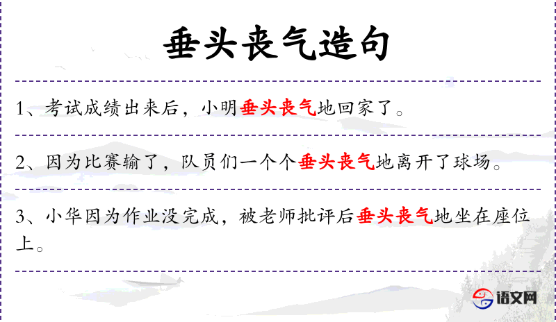 - 垂头丧气:形容词短语,形容人因失望或沮丧而显得无精打采。