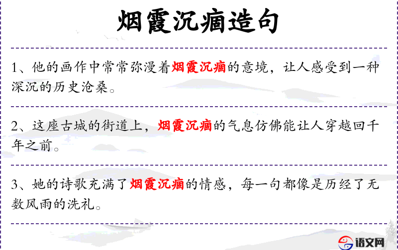1. 【烟霞沉痼】 - 烟霞:指山水;痼:久治不愈的病,比喻积久成习,不易改变的嗜好、习惯。指爱好山水成癖。