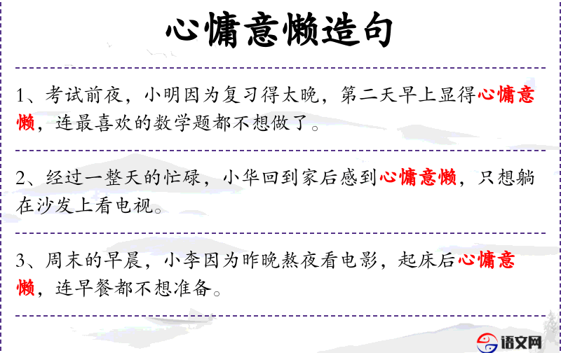 - 心慵意懒:成语,形容心情懒散,不愿意做事。