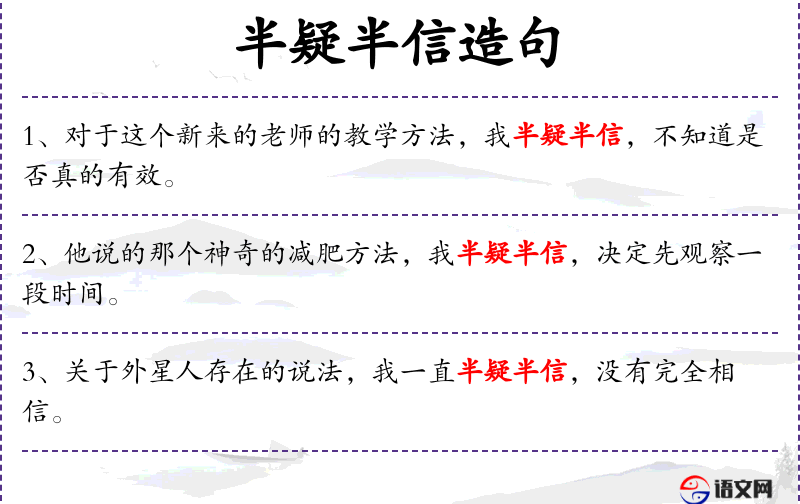 1. 【半疑半信】 有点怀疑,又有点相信。表示对真假是非不能肯定。