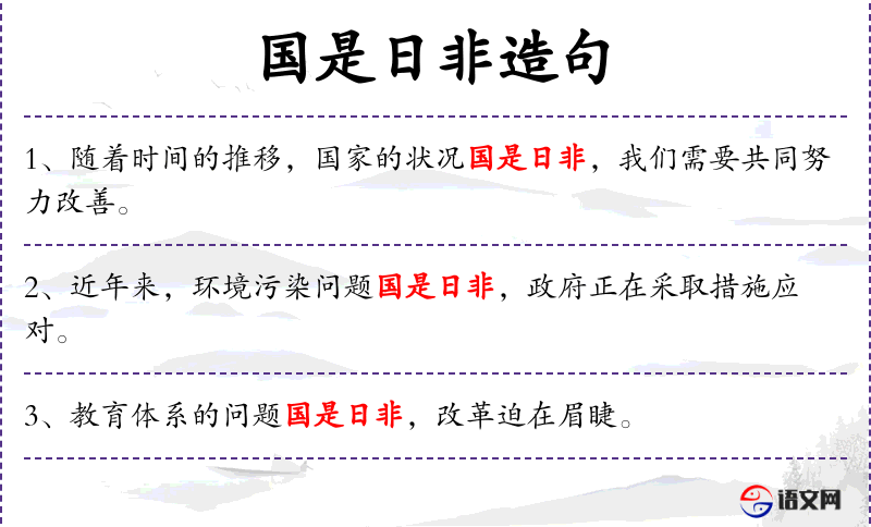 2. 【国是日非】 国是:国家大事。国家的前景一天不如一天。