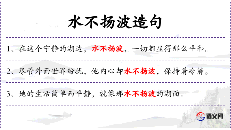 1. 【水不扬波】 扬:高举,往上升;波:波澜。水面很平静,没有波浪。