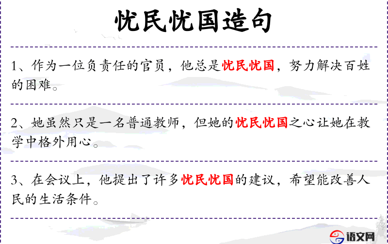 - 忧民忧国:动词“忧”重复使用,表示对民众和国家问题的深切关心。
