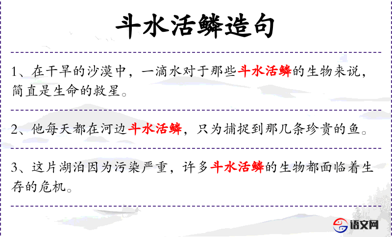 1. 【斗水活鳞】 比喻得到微薄的资助而解救眼前的危急。
