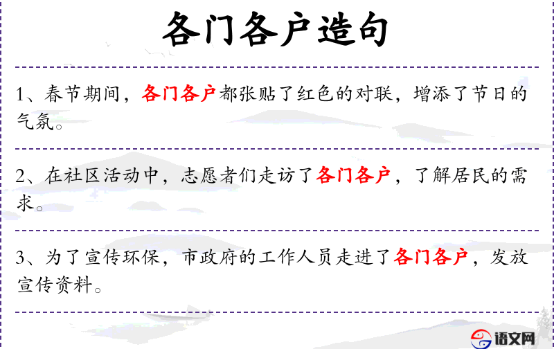 - 各门各户:指社区内的每一户人家。
