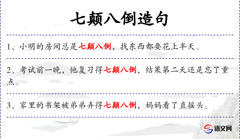 - 七颠八倒:杂乱无章、颠三倒四、乱七八糟