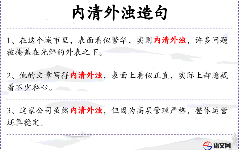 - 内清外浊:形容一个人内心纯洁,外表却可能显得复杂或不单纯。